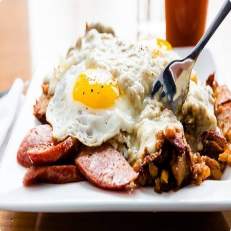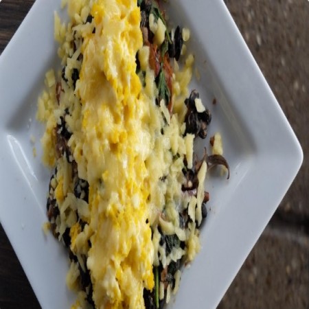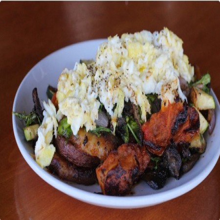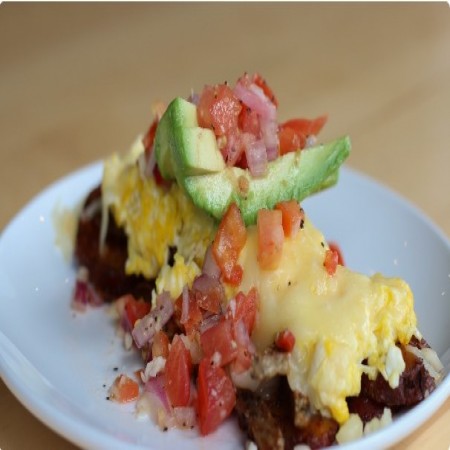 three local eggs, served over breakfast potatoes