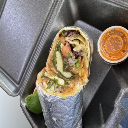 4 enchiladas with potatoes and sausage topped with cabbage ,tomato, onion